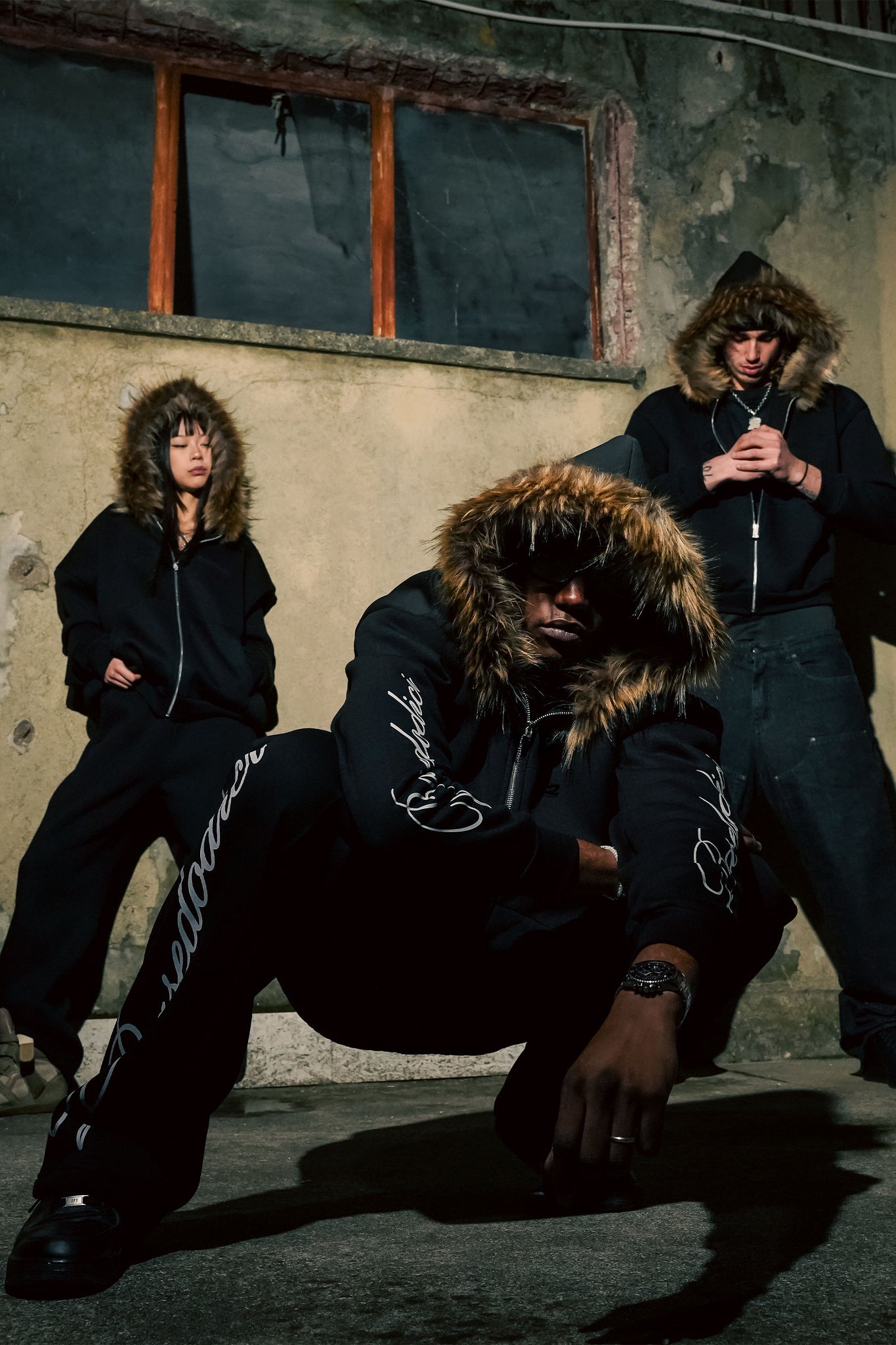 Full Zip "RUDE DIAMOND" Faux Fur Script Black