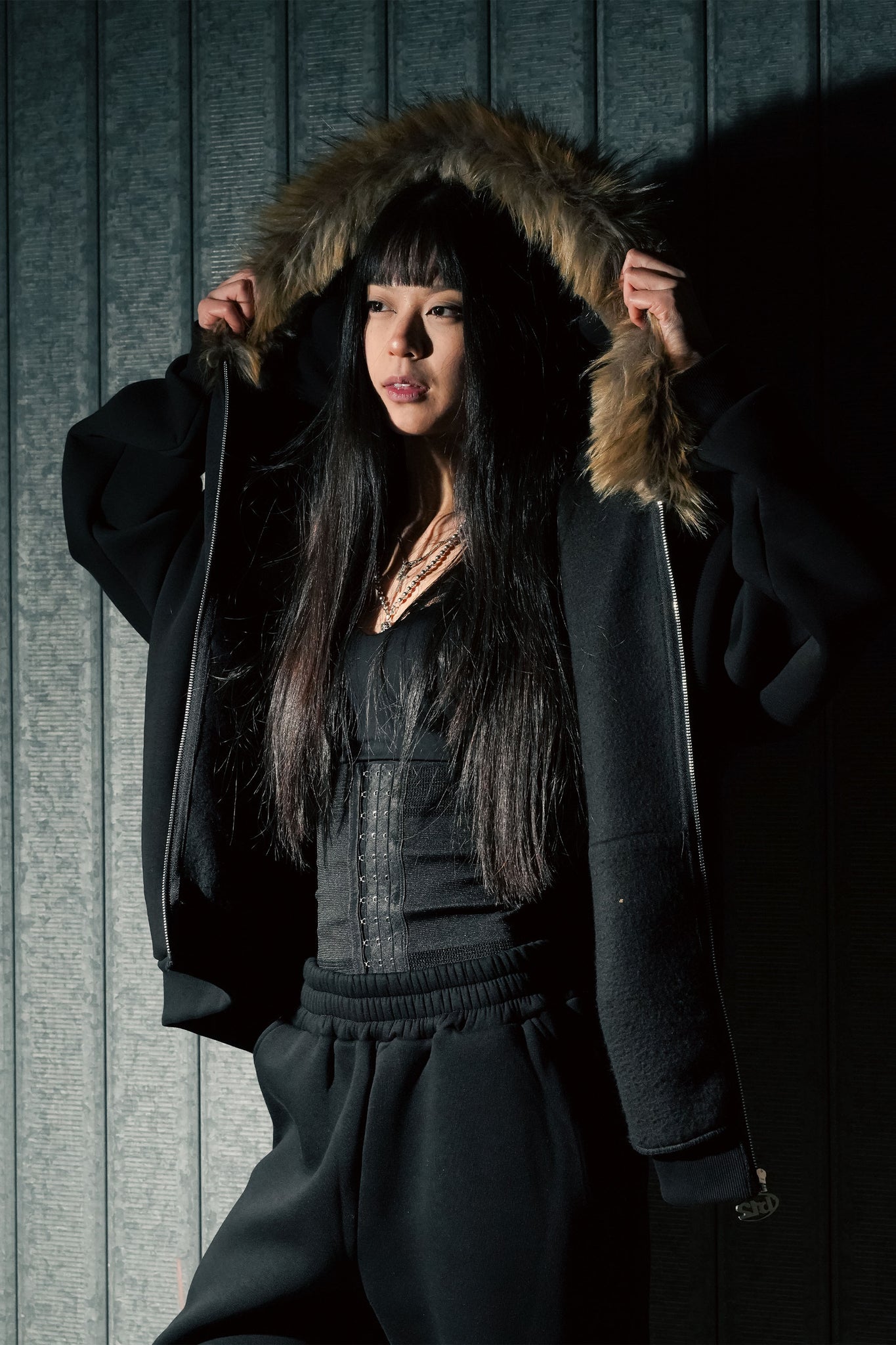Full Zip "RUDE DIAMOND" Faux Fur Script Black